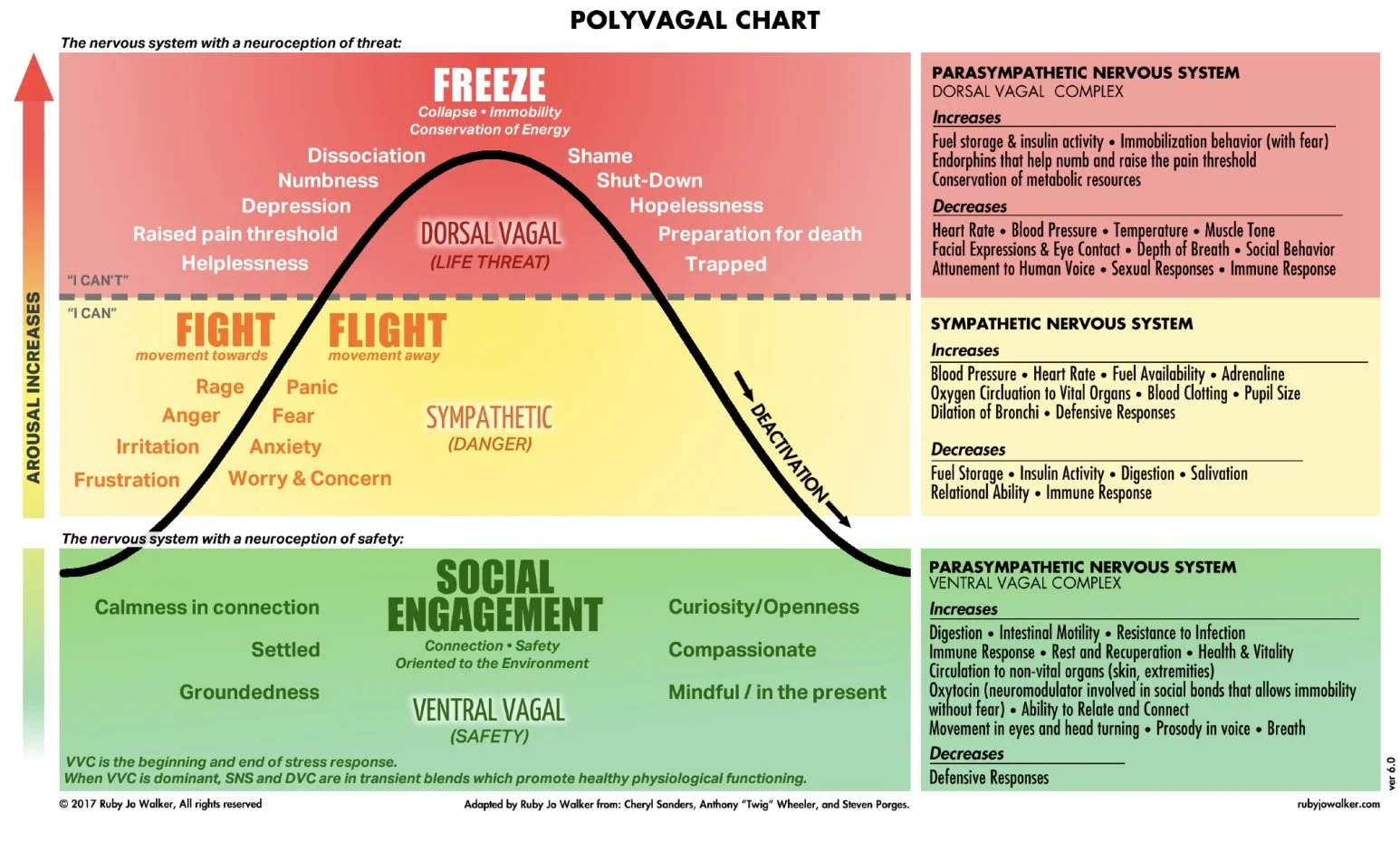 Esta gráfica explica cómo el sistema nervioso responde a la seguridad y a la amenaza a través de tres estados principales: interacción social (ventral vagal), lucha/huida (simpático) y congelamiento (dorsal vagal). Estos estados determinan nuestras emociones, conductas y funciones fisiológicas, mostrando cómo pasamos de calma y conexión a ansiedad o inmovilidad según el nivel de activación y percepción de seguridad.